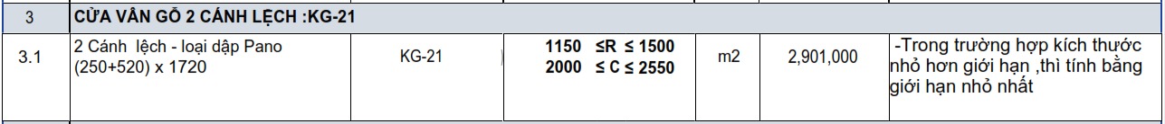 | 2 | Cửa chính Luxury 2 cánh lệch KG-21.04.04A | 1200 | 2500 | m2 | 4.25 | 1 | 2,901,000 | 8,883,000 | Đơn giá áp dụng cho cửa có chiều dày tường tối đa là 130mm, tường dày hơn 130mm thì mỗi 10mm dày thêm cộng 10.000đ/m2 cửa | |