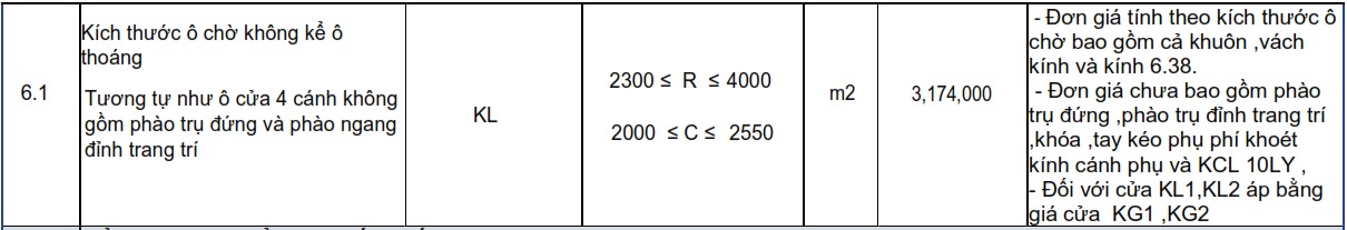 1Cửa chính 4 cánh lệch KG-4128003000m28.40 1 3,069,000 25,779,600Đơn giá áp dụng cho cửa có chiều dày tường tối đa là 130mm, tường dày hơn 130mm thì mỗi 10mm dày thêm cộng 10.000đ/m2 cửa